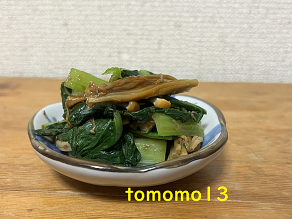 とうとう部屋着のトレーナーを出して着ました。 タンクトップで過ごしていた週末、肩に布があるだけでなんか優しさに包まれた感じでほっこりしました。 肩を温めるのは結構重要だなと感じました。 今夜のおつまみ 『小松菜とえのきの梅肉ポン酢和え』です。 週末ってことで料理しようかな~って気分になりました。 1週間以上冷蔵庫に置いてあった小松菜はチョイしなしなになってしまって可哀そうな存在になっていました。 よくぞ冷蔵庫で生きていてくれてありがとう… 明日には死んでいたと思う。 今回の食材と調味料 小松菜、えのき、梅干し、ポン酢、かつお節。 ※ポン酢の横にある白い袋の物が梅干しです。 梅干しの代わりに梅肉…