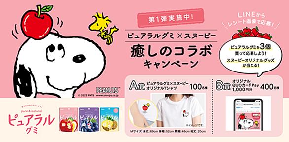 カバヤ食品ピュアラルグミ×スヌーピー 癒しのコラボキャンペーン第2弾 賞品 <A賞>ピュアラルグミ×スヌーピー オリジナルクッション/100名 <B賞>オリジナルQUOカードPay1,000円分/300名 応募方法 キャンペーンアカウント「カバヤ食品 キャンペーン」を友だち追加して、LINEトークルームのメッセージに従って、レシート有効期間中に購入した 「ピュアラルグミ」3個を含むレシートを撮影して応募 応募期間 レシート有効期間/2023年9月1日(金)〜10月31日(火)2023年9月1日(金)10:00〜10月31日(火)23:59まで 締切 個人的感想 ピュアラルグミは、りんご、ぶどう…