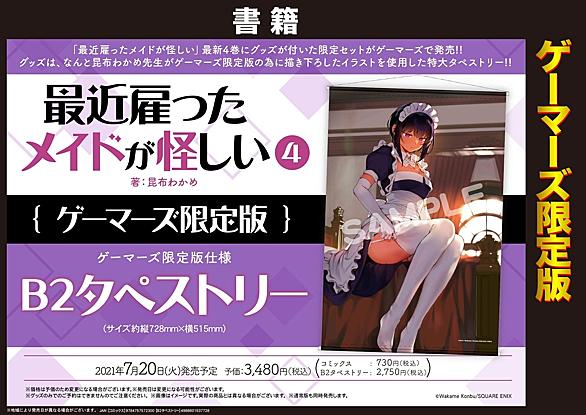 最近雇ったメイドが怪しい 4巻 発売日:2021年7月20日 著者:昆布わかめ ゲーマーズ限定版 通常版 価格 ¥3,480円 ¥730円 【ゲーマーズ限定版】・B2タペストリー付き 【重要】本商品の価格は「予価」であり、正式に価格が決定した際にお客様にメールにてご案内を行います。予価よりも価格が高くなる場合には「価格変更手続き」が必要となりますため、大変恐れ入りますが必ずメールを受信できる環境でご注文いただけますようお願いいたします。なお、「価格変更手続き」が可能なのはメール受信後一週間以内となり、期限内のお手続きが無い場合自動的にキャンセルとなりますので何卒ご注意ください。 【漫画】最近雇…