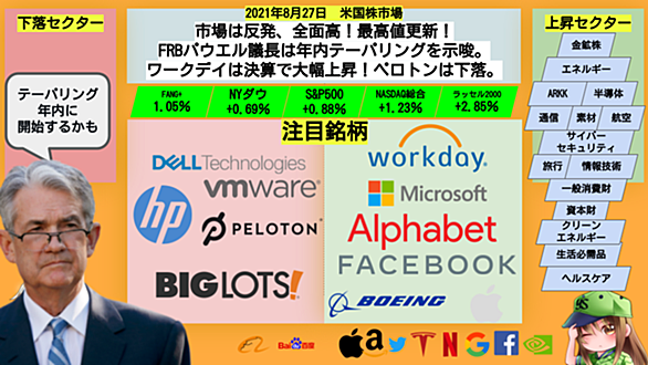 米国株市場の状況の振り返りと私見をまとめていきたいと思います。 全面高の1日となっています。ジャクソンホール会議でのパウエル議長の発言に注目が集まった1日ですが投資家には安心感を与える内容となっています。 【米国株】市場は反発、全面高!!FRBパウエル議長は年内テーパリングを示唆。ワークデイは決算で大幅上昇!ペロトンは下落。 *1 毎日レバナスとレバFANGに積立しグロース株中心に投資をしているサラリーマン投資家のうみひろ(@uminoxhiro)です。 ブログを読みに来てくださってありがとうございます。 昨晩の米国株市場の振り返りを今日も行っていきます。 今日も成績に左右されないで元気にいく…