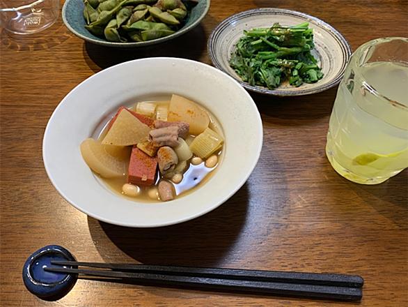 朝からの曇り空…。暖かい立冬から一転、最高気温が15度までしか上がらなかった、肌寒い日でした。暖まりたい!気分は昭和の居酒屋オマージュ(笑)。白モツ煮、いきましょう! 丁寧に処理した白モツと大根、近江赤蒟蒻、豆類、茸を、日本酒と生姜たっぷりに、久米島の黒糖や醤油を足して、くつくつ煮込みます。仕上げには、深大寺の鬼七味をはらり。 春菊の胡麻和え、名残の丹波の黒枝豆等を並べて。晩酌はジン&ライムで(ニッコリ)。こんな感じには、ボンベイ・サファイア・ジンの植物の香りが似合います。ゆっくり、時間がながれます。 そうして、身体と気持ちがほぐれたら…。甘くヒンヤリした品を、所望!(笑) 贅沢なフローズン・…