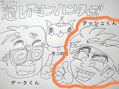 え、ダッシュくん? ダッシュくんのほうは今どうしてるかって?あのスーパーレアモンハンターズのダッシュくんですか?見切りあたりおっちょこバッタリそそっか発車なダッシュくん、 データくんに毎度「正確にはデスね…」とレアモンの名称を正されていたが、 狙った獲物は絶対!! を信条にデータくんも及ばぬ力技でチャンスをモノにしてきた。 定時制の夜間校に通いながらの時空トラベルは大変だったと思うよ。 で、現在は居酒屋「レア海鮮うまかモン 蘇我ハーバーシティ店」の副店長に昇格し、 短期パートだった十九も年下の微シャクレ美女店員に即手ェ出して即結婚。 オフ日となるや微シャクレ女房微シャクレ赤んぼスッ放ってチヌ釣…