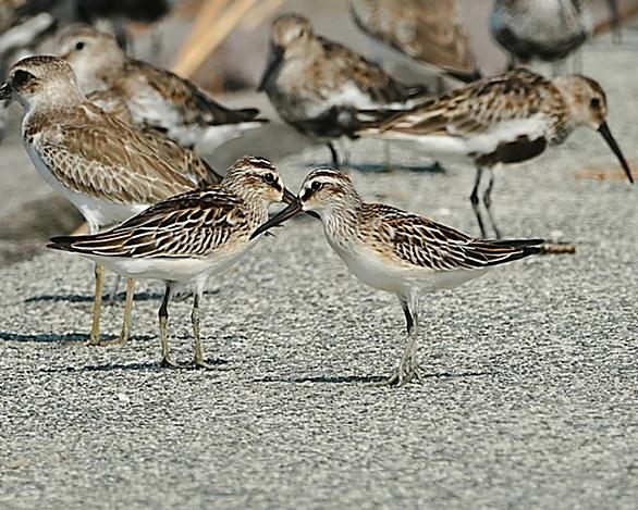 干潟にて:...シリーズの最後になります。今回は小型の3種類を紹介します。夏から秋へと向かう干潟で、たくましく生きるシギたちの姿を観察でき、とても充実した時間を過ごせました。シギやチドリの名前を覚えるのに苦労していますが、一番の解決策はやっぱり場数を踏むことのような気がします。 ◆ キリアイ旅鳥として春と秋の渡りの途中に飛来 大きさ比較:右はハマシギ ◆ミユビシキ◆メダイチドリ一番手前の夏羽から冬羽へグラデーション 大きな目がチャームポイント奥の3羽はソリハシシギ ご覧いただきありがとうございます にほんブログ村 鳥写真ランキング ランキング参加中野鳥観察