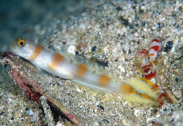 和名:なし 学名:Stonogobiops dracula Polunin et Lubbock, 1977 英名:ドラキュラ・ゴビー/ドラキュラ・シュリンプゴビー(Dracula shrimp-goby) 分布:インド洋(セイシェル、モルジブ) 撮影日時:2000-02-09 撮影場所:モルジブ(ヴィラメンドゥ・ハウスリーフ) 撮影器材:Nikon F4 + 100マクロ x 2倍テレコン 日本はもちろん、フィリピンやインドネシアなどの太平洋にもおらず、モルジブなどのインド洋固有種です。 特徴は、ネジリンボウのように黒い縞が斜めになっておらず、体に直角に近いこと。そのため、「捩れていないネジ…