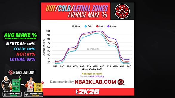 NBA 2K26のホットゾーンとリーサルゾーンはどの程度の効果があるのか。 2K25の時はきちんとした検証がなかったような気がする。 今年はNBA2KLABが検証したようなので見てみよう。 www.youtube.com この動画では、ホットゾーン、リーサルゾーン、およびコールドゾーンでのシュート成功率とグリーンウィンドウの変化について、約1万回のシュート行って検証している。 ゾーンごとのシュート成功率 このテストでは、3pt能力92のシューターがバッジやブーストなしで、ゾーンごとにシュートを行い、その成功率を集計している。 ノーマル 平均成功率は約58%。 グリーンウィンドウは約10ミリ秒。…
