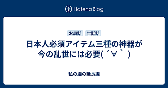 - 天叢雲剣(あめのむらくものつるぎ):熱田神宮の神体。須佐之男命(すさのおのみこと)が八岐大蛇を退治した時に尾から出た太刀。後に日本武尊(やまとたけるのみこと)が敵の火攻めに遭った時、この剣を以て叢(くさむら)を切り開き難を逃れたことから「草薙剣(くさなぎのつるぎ)」とも。源平合戦の最後壇ノ浦合戦で水没し今のものは順徳天皇即位の際に改めて奉じられたというのが一般的な説。
