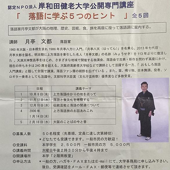 岸和田健老大学公開専門講座~2025.11.12 今日は食に関するお話。 「饂飩」と「お蕎麦」。関西と東京の名前の違い「きつね」と「たぬき」。「ハイカラ」と「たぬき」。「しっぽく」と「おかめ」。 落語に出てくる食べ物、「うどん」(時うどん、風邪うどん)、鰻(うなぎ屋、殺生鰻、遊山船)、みかん(みかん屋、千両みかん)、饅頭(饅頭こわい)、ふぐ(ふぐ鍋)、蛸(蛸芝居)、茶漬け(京の茶漬)、餅(尻餅)、鯛の浜焼き(鴻池の犬)、人参、棒鱈、高野豆腐(煮売り屋)、田楽(田楽喰い)、柳影、青菜(青菜)。 最後に、「ふぐ鍋」の一席。 岸和田健老大学公開専門講座「落語に学ぶ5つのヒント」 ~落語と食文化を考察…