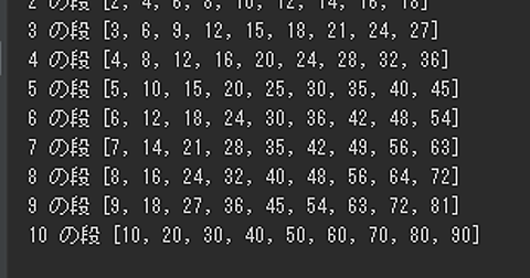 今回はPythonで掛け算を計算するプログラムを組んでみました。 段数は自分で入力した数字で、n×9を計算するプログラムになっています <プログラム> x=int(input())kekka=[]for i in range(1,x+1): for j in range(1,10): y=0 y=i*j kekka.append(y) if len(kekka)==9: print(kekka[0],"の段",kekka) kekka=[] <実行結果>