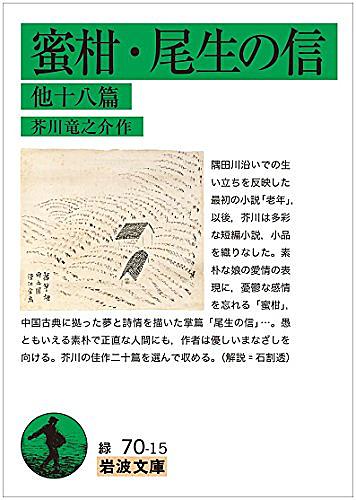 ・岩波文庫31-070-15(2) 昨日「違和感」があるので「手にしていない」と書いた岩波文庫だが、勤めの帰りに図書館に立ち寄ったら棚にあったので借りて来た。刊年月日・定価・頁数は昨日の記事に追加して置いた。 カバー表紙の紹介文は以下の通り。 隅田川沿いでの生/い立ちを反映した/最初の小説「老年」,/以後,芥川は多彩/な短編小説,小品/を織りなした。素/朴な娘の愛情の表/現に,憂鬱な感情/を忘れる「蜜柑」,/中国古典に拠った夢と詩情を描いた掌篇「尾生の信」…。愚/ともいえる素朴で正直な人間にも,作者は優しいまなざしを/向ける。芥川の佳作二十篇を選んで収める。(解説=石割透) 「尾生の信」は表題…