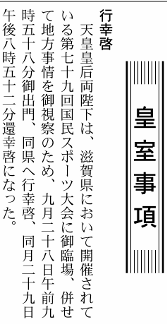 予定発表された今上ご一家ご予定 9月28日(日)~29日(月)両陛下 滋賀県訪問(第79回国民スポーツ大会出席など) 9月30日(火)天皇陛下 御所(スリランカ大統領 会見) 10月4日(土)~6日(月)両陛下 京都府・大阪府訪問(京都府立植物園、桂離宮視察など) 10月5日(日)~6日(月)愛子さま 滋賀県訪問(第79回国民スポーツ大会競技観戦など) ※3日、愛子さまコロナ感染のため5~6日滋賀県訪問を中止すると発表。 実際のご活動 (28日) 天皇皇后両陛下 皇居御発 天皇皇后両陛下 ご昼食(米原市役所(米原市)) 天皇皇后両陛下 ご臨席(総合開会式)(彦根総合スポーツ公園陸上競技場(平和…