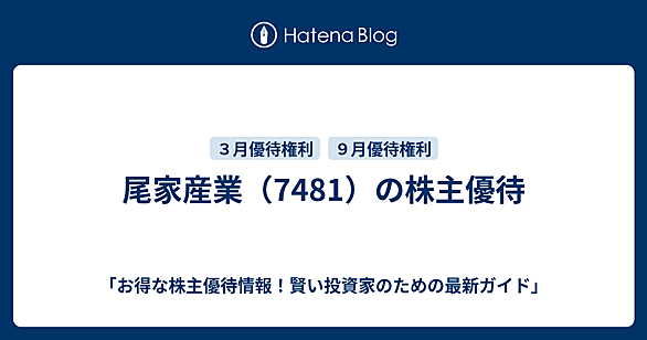 hb.afl.rakuten.co.jp 検索 尾家産業(7481)の株主優待 www.oie.co.jp 尾家産業(株)の株主優待情報 🎁 📅 基本情報 権利確定日: 3月末日・9月末日 単元株数: 100株 優待の種類: 飲食料品 🎁 株主優待の内容 🎁 3月末日の優待内容: 100株以上: ① スペシャルビーフカレー詰合せセット 1,000株以上: ② 紀州南高梅干し 3,000株以上: ③ 自社商品セット(7種類から選択) 9月末日の優待内容: 継続保有3年以上の株主に提供。 100株以上: ③ 自社商品セット(2,000円相当) ※ 継続保有3年以上の定義: 毎年9月末日、同一株主番…