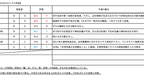 今週の評点: リスク +6点(48点):大幅良化 (基準点42点) 経済指標 -4点(44点):悪化 (基準点48点) 次週の相場感:強気のニュートラル ①リスク 今週は重要な政治イベントであった英国総選挙と、米中貿易摩擦の追加関税発動期限がありました。 英国総選挙は与党保守党の圧勝に終わり、1月末の「秩序ある離脱」へ向けて大きく前進することとなりました。これまで混迷を極めたブレグジット問題ですが、保守党が過半を握ったことで離脱へ向けて粛々とEUとの協議が進むものと思われます。 また、米中貿易摩擦では、兼ねてから協議中であった第一段階合意が達成されたことが米中両国から表明されました。米中貿易摩…