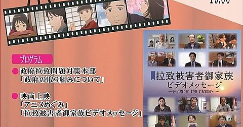 -その命、見捨てますか?- 《インチキ遺骨ではなくて、拉致被害者を返せ!拉致問題展示会開催》 ■北朝鮮人権侵害問題啓発週間事業 北朝鮮人権侵害問題啓発週間事業の一環として、拉致問題の年表などを展示します。 1.日時・場所等 ◆日 時:令和元年12月8日(日曜日) 午後2時から午後4時 ◆場 所:メセナひらかた会館 多目的ホールロビー ※大阪府枚方市新町2丁目1-5 ◆共 催:枚方市、枚方市教育委員会、特定非営利活動法人枚方人権まちづくり協会、枚方地区人権擁護委員会、枚方事業所人権推進連絡会 ◆入場は無料ですが、事前申し込みが必要です 2.プログラム ◆拉致問題に関する展示 ◆ミニ演奏会「野田あ…