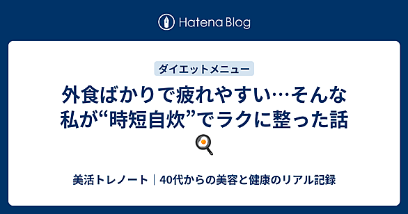 この記事でわかること なぜ40代から“自炊”が効くのか? 忙しくてもできる“時短自炊”の工夫とは? 無理なく続けられるレシピや便利アイテムもご紹介 結論・気づき 自炊は「ちゃんとやる」より「続けられる」が大事 油を使わないだけでも、自然とカロリーが抑えられる 冷凍野菜×電子レンジだけで、ちゃんとバランスごはんになる 私が“時短自炊”を始めた理由 40代に入ってから、「体重が落ちにくいな…」「最近なんだか疲れやすい」と感じることが増えました。昔は平気だった外食も、続くと体が重く感じたり、肌が荒れたり。 そんなときに始めてみたのが、“時短自炊”でした。 「手間がかかりそう」「料理は苦手…」と思って…