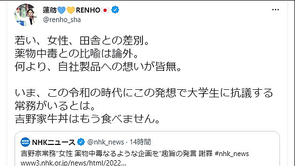 月餅でも喰っとけ立憲 #蓮舫議員、不適切発言受け「吉野家牛丼はもう食べません」とツイートし物議 → その後投稿を削除 : ツイッター速報 https://t.co/UQgUVLXgbn — いとうちゃん【公式】 (@keitaboo2000) 2022年4月20日 ********************************************************************************************** ************************************************************************…