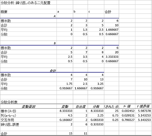 前回に続き二元配置分散分析(two-way ANOVA)。 データの準備 繰り返しのある二元配置分散分析としてこちらのデータを使用する。 要素1:a, b, c 要素2:A, B 分散分析(標本・列) 今回は交互作用の効果をF検定進めていく。 下記式でいうところのを求めていくことになる。 交互作用の分散 交互作用を一言でいうと「二つの因子が組み合わさったときに追加で出現する効果」ということが出来る。ある成分をa→bに変えた時、もう一方の成分がAかBかで異なる効果が現れる。 それぞれの効果を足し算した予想値からずれる要素が交互作用と言える。下図をみてピンとくる方もいるかと思うが、やってることは誤…