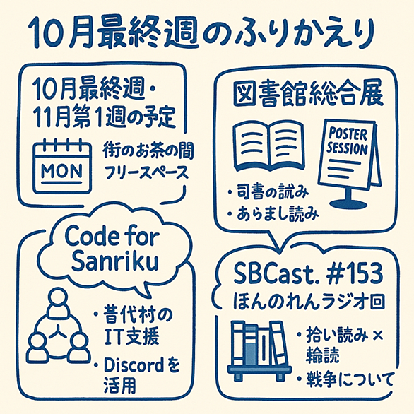 ChatGPT作今週のグラレコ 今回も毎日やっているちえラジChatより、今週一週間の配信内容を中心にお届けします。 なお前回のとおり、AIの原稿はこちら。気になる方はご覧ください www.notion.so この一週間は、地域活動への参加から読書や書籍のあり方、そしてIT技術者と地域との関わりという、複数のテーマについて深く考える機会に恵まれました。特に、学生が地域と関わる機会があるにもかかわらず、IT技術者として就職後にその関心を失ってしまう現状について、残念ながらも問題意識を持ちました。また、書籍の価値を再認識した「図書館総合展」への参加や、地域活性化を目指す新たな団体「Code for…