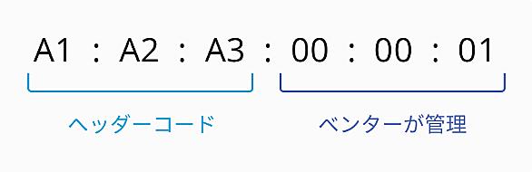 上位3バイトはIEEE*1が機器の製造者(ベンダ)ごとに割り当てた、ベンダ固有の値(ベンダコード)。下位3バイトはベンダが自社製品に一意に付与した値。これらの値は固定的に割り当てられ,重複することはない。このようにして同一の識別番号が異なる機器に割り当てられることを防いでいる。すなわちMACアドレスは各ネットワーク機器に固有の一意な値。