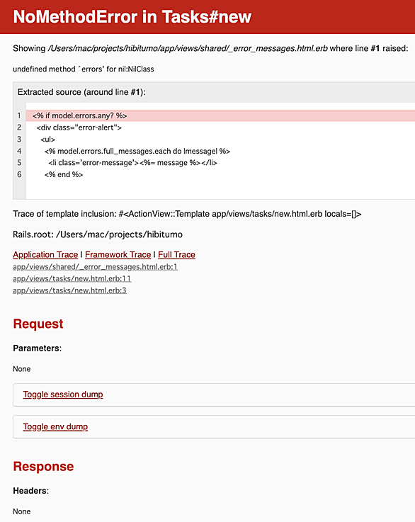 皆様、こんにちわ。 U_OK_2023 です。 本日も、朝から就活のために求人を探したり、メールや通知の対応をしておりました。 その合間に、オリジナルアプリの続きをしております。内容は、タスク投稿機能です。 早速、 エラー発生 ルーティングを設定し、コントローラーを記述し、対応するビューを作成。ビューが表示されるか確認するために、 localhost:3000/tasks/new へアクセスしたところでエラーが発生 ①何が問題でどうしたい エラーを解決し、tasks/new ページを表示させたい ②現在(位置) MVCにおけるV ③問題点 モデル が nil であるということ ④仮説 unde…
