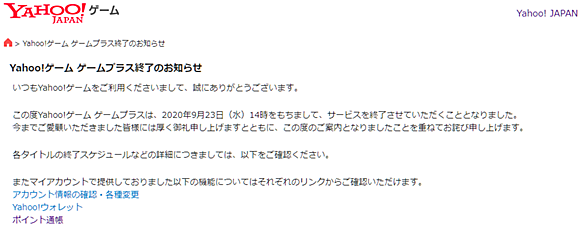 // Yahoo!ゲーム ゲームプラス終了のお知らせ いつもYahoo!ゲームをご利用くださいまして、誠にありがとうございます。この度Yahoo!ゲーム ゲームプラスは、2020年9月23日(水)14時をもちまして、サービスを終了させていただくこととなりました。 今までご愛顧いただきました皆様には厚く御礼申し上げますとともに、この度のご案内となりましたことを重ねてお詫び申し上げます。各タイトルの終了スケジュールなどの詳細につきましては、以下をご確認ください。またマイアカウントで提供しておりました以下の機能についてはそれぞれのリンクからご確認いただけます。 // ★以下、各ゲームの対応です。 /…